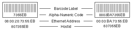 The Machine Type and lower 3-bytes of the MAC Address form the Hostid. Licensed software may use the Hostid. Prior to the SPARCstation 10, the Machine Type was used by the operating system to identify the architecture and the architecture implementation. Machine types were unique to each system. Beginning with the SPARCstation 10 in 1992, a unique Machine Type is not assigned. The device tree in OBP provides the system characteristics to the OS. The high-order bit of the Machine Type was set to 1 for a Machine Type of 0x80. The upper 3-bytes of the MAC address were changed to 00:03:BA in February 2001. The Machine Type was changed to 0x83 to avoid duplicate hostids. Machine Type 0x83 requires an OBP change to fix BugID 15044782 [SUNBT4389716]. The alpha-numeric code on the barcode label is used to program a replacement part. The code for MAC addresses starting with 08:00:20 represents the last 6-digits of the 12-digit address. MAC addresses starting with 00:03:BA have a 12-digit code on the label.