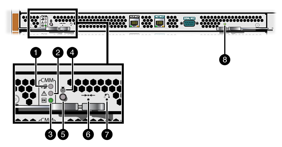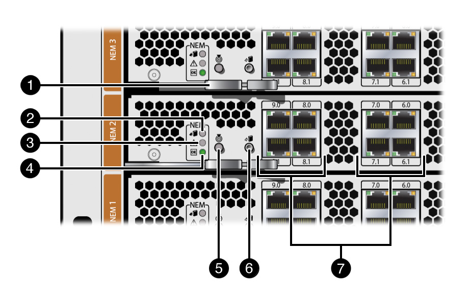 The Network Express Modules (NEMs) and PCI Express ExpressModules (EMs; Sun Blade 8000 Chassis only) provide a standard set of status indicators, buttons, and Ethernet